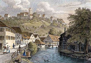 1100 | 1. urkundliche Benennung des Adels von Aach. Aha = germanisches Flußnamengrundwort. Der Ortsname ist älter als der Flußname. |